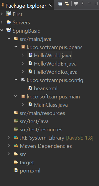 | src/main/java 에 패키지[kr.co.softcampus.main] -> MainClass.java 파일 작성 패키지[kr.co.softcampus.config] -> beans.xml 파일 작성 패키지[kr.co.softcampus.beans] ->HelloWorld 인터페이스 작성(추상메소드 sayHello() 정의) ->구현한 (1) HelloWorldEn 클래스 작성 (2) HelloWorldKo 클래스 작성 |
