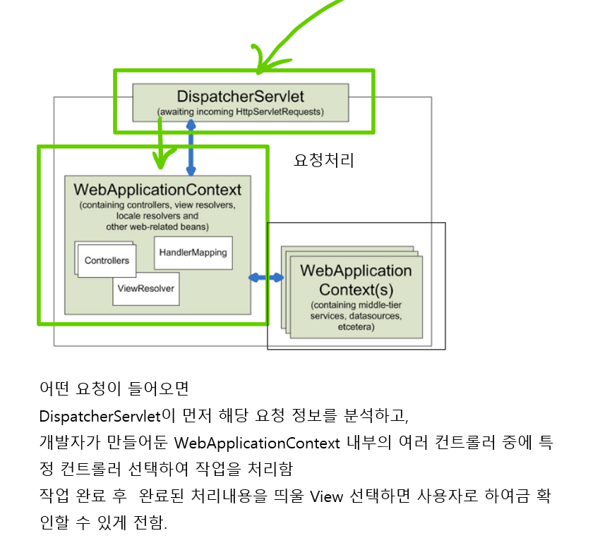 -Spring MVC는 DispatcherServlet을 확대하여 Spring Framework가 가지고 있는 기능을 사용할 수있도록 이 클래스를 재정의하고 있다.