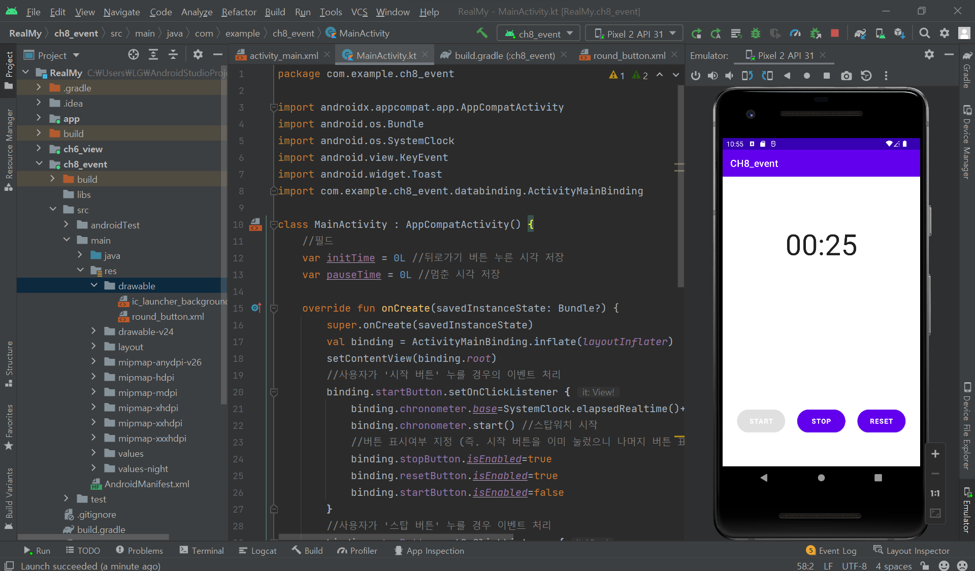 | 1) 새 모듈 생성 2) gradle 파일에 추가 android { viewBinding{ enabled= true } } 3) 모서리 둥근 버튼을 xml 파일로 만들기 4) 앱 화면 구성 : activity_main.xml 5) 메인 액티비티에 '사용자 이벤트' 처리하기 |