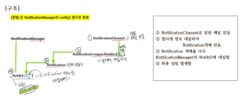 | 앱 알림 터치 시 -> [실행 정보]를 Notification 객체에 담아 시스템에 이벤트 실행 의뢰 -> 실제 이벤트 발생 시점에 Notification 객체에 등록된 내용을 시스템이 실행함 |