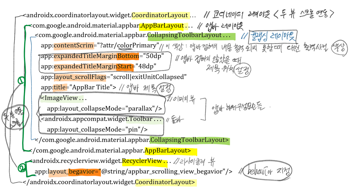 | -전체를 CoordinatorLayout으로 감싸고, 그 하위에 앱바 레이아웃/리사이클러 뷰 등록 즉. 앱바 레이아웃과 리사이클러 뷰의 스크롤을 연동하려는 의도 앱바 레이아웃 하위에 다시 CollapsingToolbarLayout 선언 그 하위에 다시 앱바의 구성요소인 툴바/이미지 뷰 등록한 구조 |