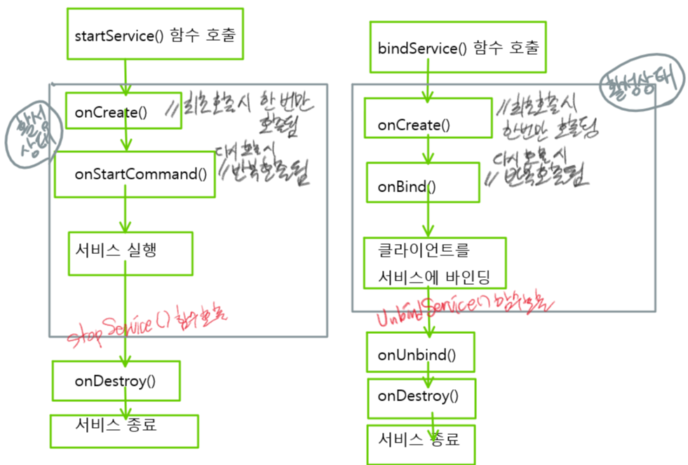 | ① 실행 : startService() 함수 | 바인딩되지 않은 서비스 종료 : stopService() 함수 . 실행 중인 서비스 종료함수 |