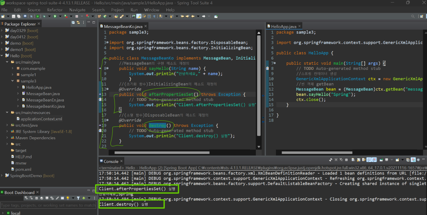 | <실행 결과 화면> MessageBeanKo 클래스는 xml 파일에 빈으로 등록되어 있는 빈 객체인데, InitializingBean 인터페이스, DisposableBean 인터페이스를 모두 구현한 클래스이다. HelloApp 속 main() 실행 시, 이 빈 객체 초기화 과정에서 먼저 afterPropertiesSet() 이 실행되고, 이 빈 객체 소멸 과정에서 destroy() 가 실행되는 것을 확인할 수 있다. |