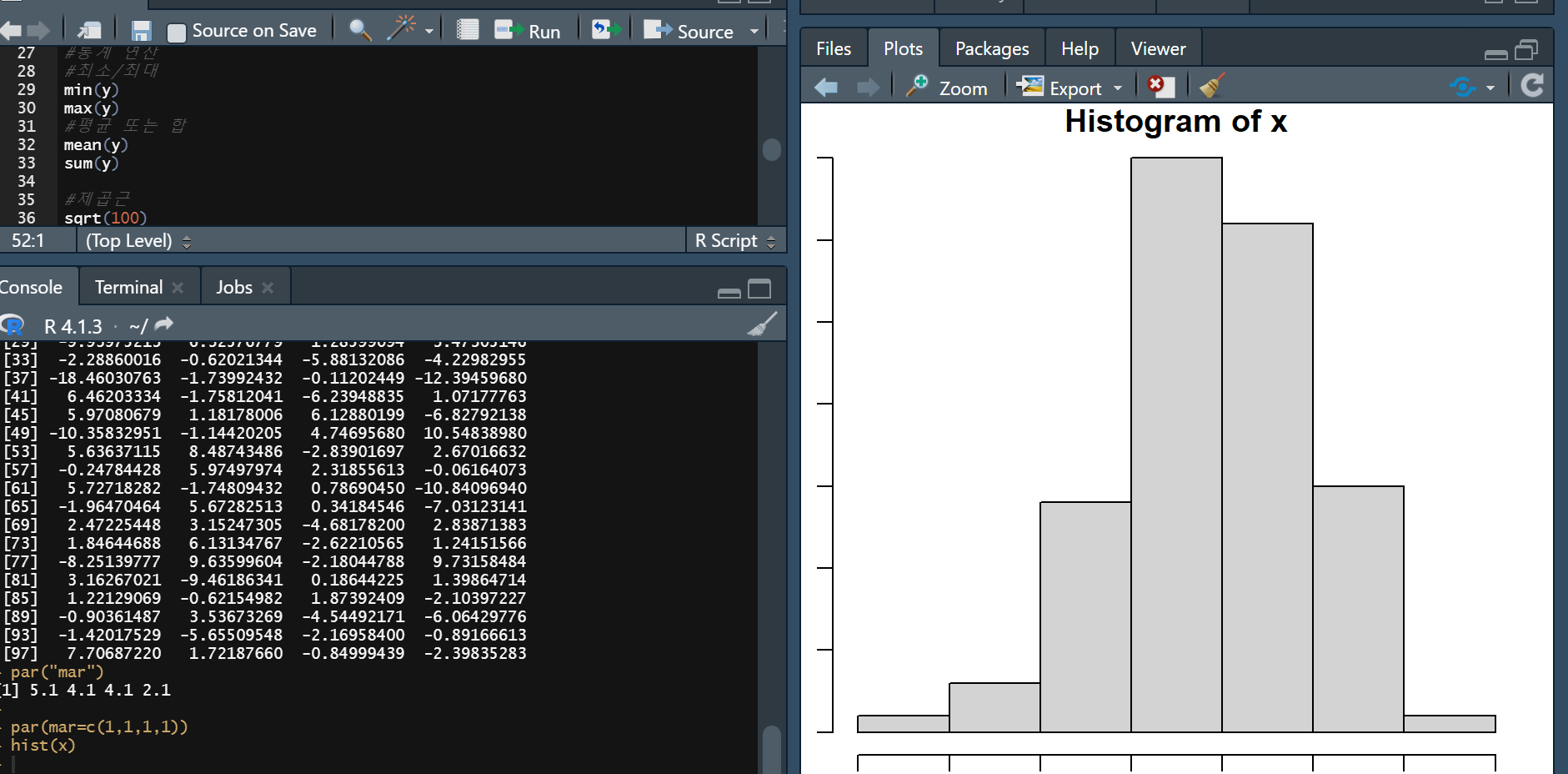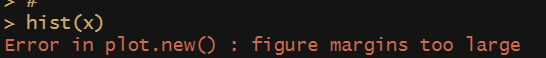 | 문제 : margin 기본 설정이 너무 좁게 설정 되어 있음 해결 : 아래 코드로 마진을 다시 설정 후 결과 확인 par("mar") par(mar=c(1,1,1,1)) 혹은 윈도우창을 최대로 늘린 뒤 결과 다시 확인 출처: https://gigle.tistory.com/88 [모조리 기획해주마] |