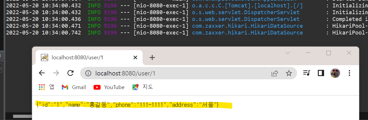- 프로젝트 실행 시킨 뒤, 서버 위에 올라간 상태에서 localhost:8080/user/1 실행