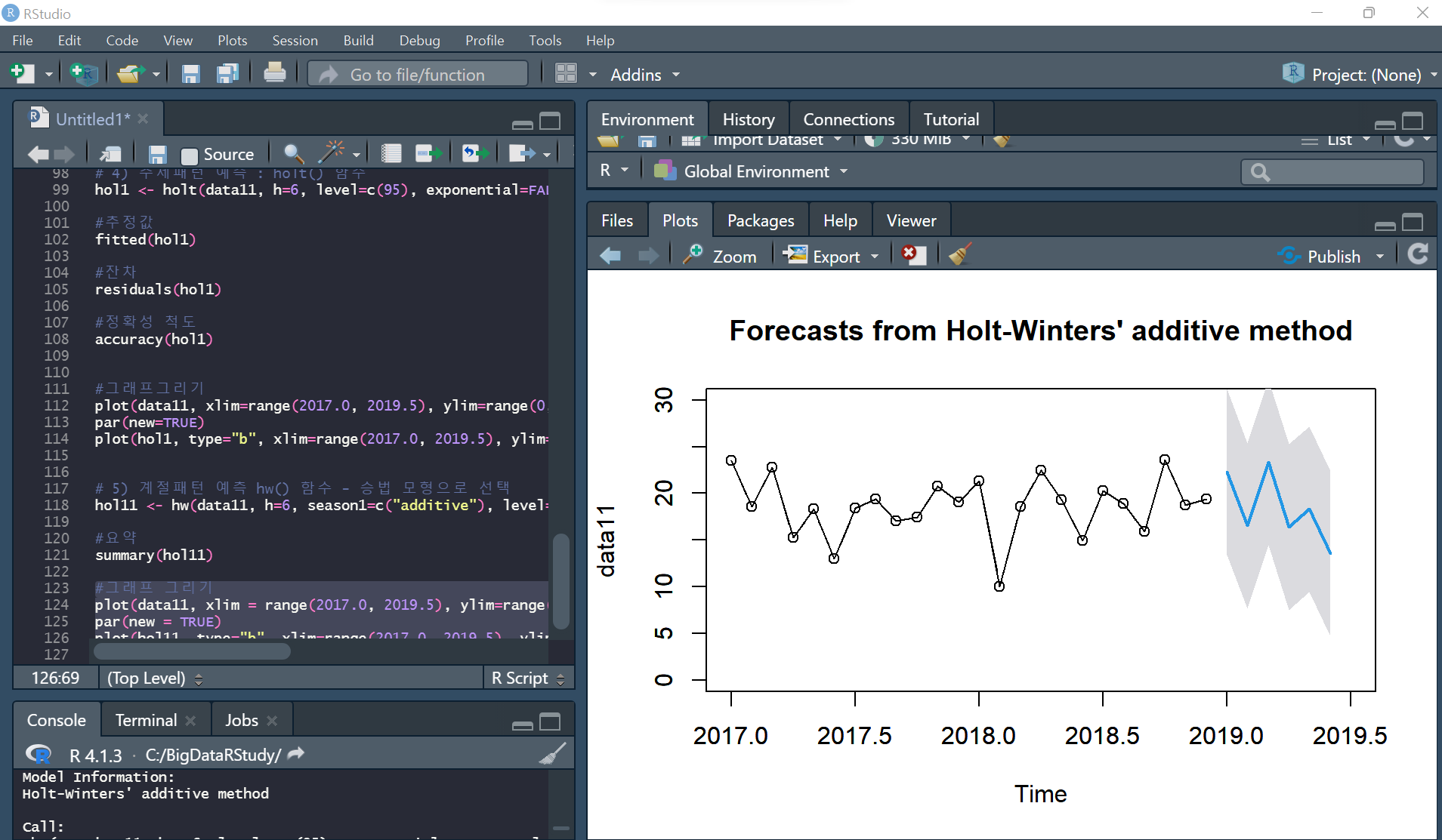 # 6) 추세와 계절성 패턴 적용 : Holtwingters() 함수