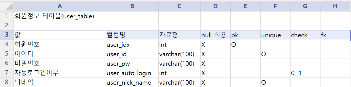 1) user_table : 사용자 회원 정보 테이블