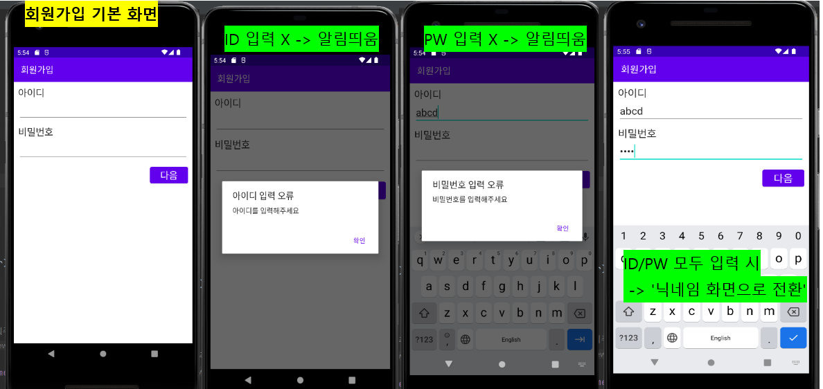 - 유효성 검사를 거친 뒤 → DIalog 알림을 띄우고 해당 입력란에 Focus()를 마치도록 이벤트 처리를 해둔다.