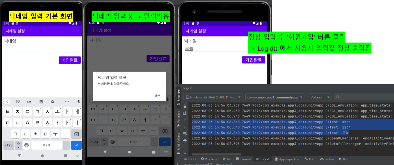 - 또한, 여기서 입력한 닉네임값과 앞서 입력하여 넘겨받은 ID/PW 값은 서버와 DB에도 보내야 하기 때문에 임시로 담아두고 Log.d로 잘 담겼는지 확인을 거친다.