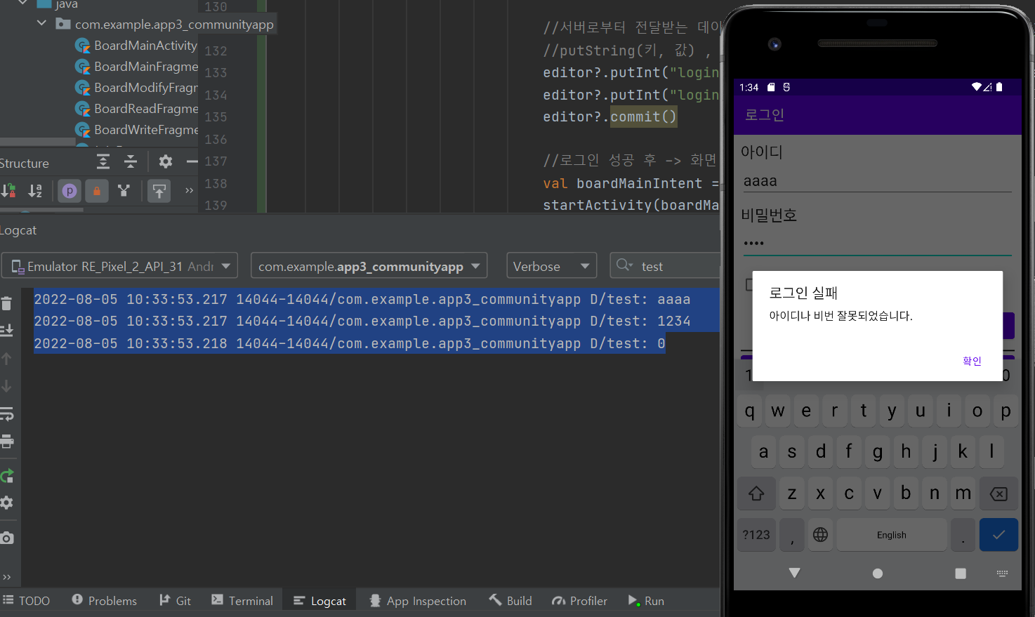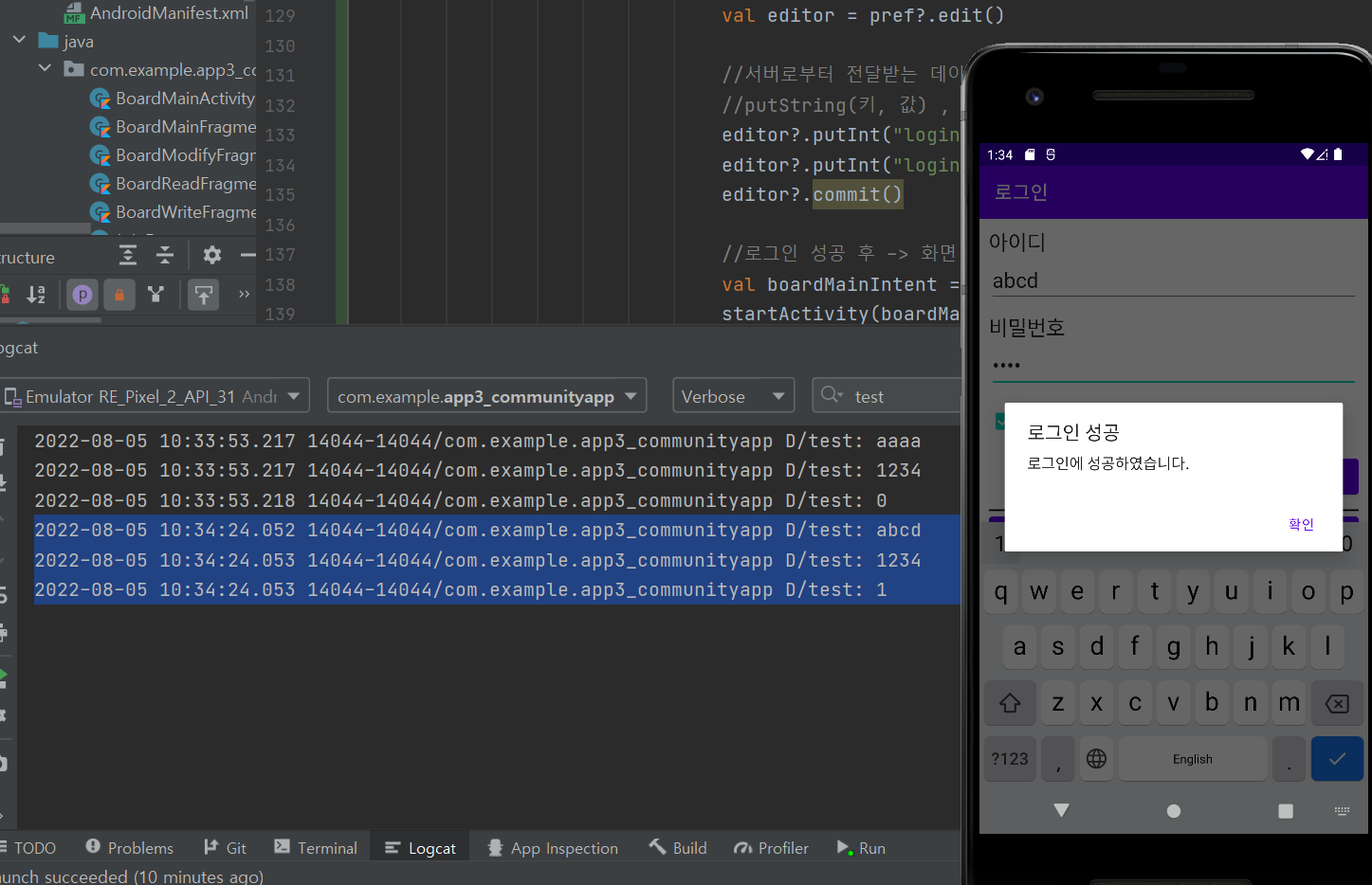- 앱에서는 서버로부터 받아온 회원 idx 값을 얻어서 Preference 형태로 각각의 값을 받아두고 로그인이 성공한 상태이므로 게시판 메인 화면으로 전환시켜준다.
