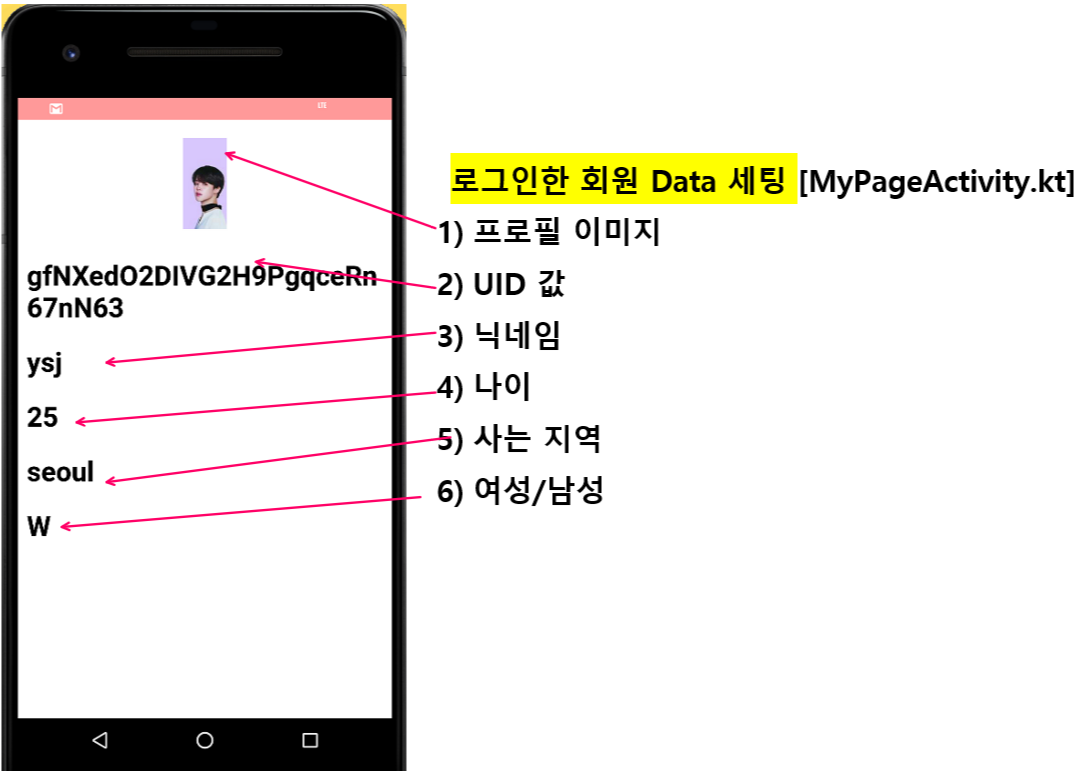 - 2) MyPageActivity.kt 에서 마이페이지 회원 페이지에 표시되어야 하는 ‘로그인한 사용자’의 회원 정보를 Storage에서 get 하여 화면에 표시한다.