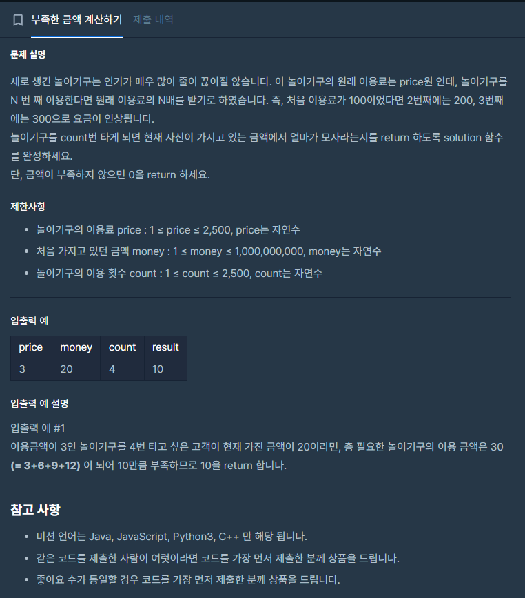 프로그래머스 | Lv.1 부족한 금액 계산하기 (Java)