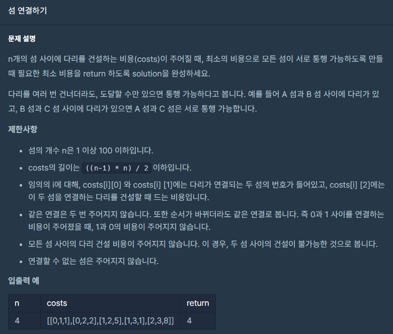 임의의 i에 대해, costs[i][0] 와 costs[i] [1]에는 다리가 연결되는 두 섬의 번호가 들어있고, costs[i] [2]에는 이 두 섬을 연결하는 다리를 건설할 때 드는 비용입니다.