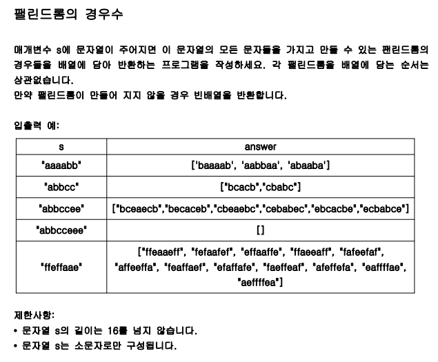 4) 만약 odd > 1 이면 빈 String 배열을 곧장 리턴해준다. (팰린드롬 못 만들기 때문)