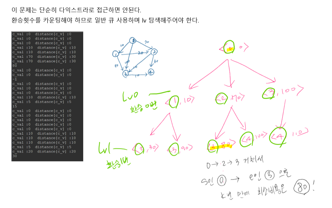 - 다익스트라는 우선순위큐로 무조건 최소비용을 구하는 게 단순 목적인데, 여기서 레벨탐색으로 풀어야 각 레벨(거쳐갈) 당 최소 비용이 구해지기 때문에 주의