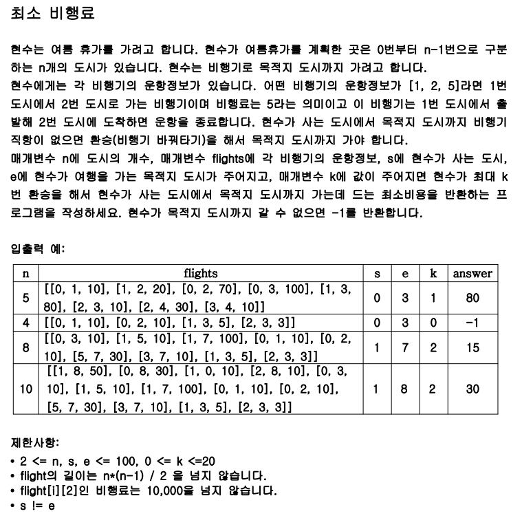 public int solution(int n, int[][] flights, int s, int e, int k){