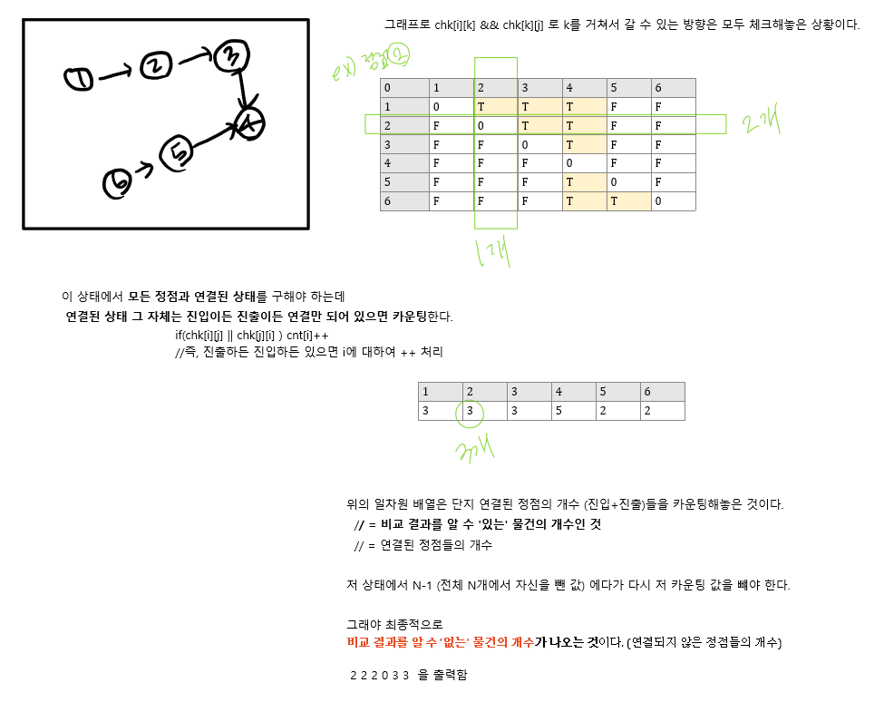 - 비교 결과를 알 수 "있는" 물건들의 개수 = (진입+진출) 연결된 정점들의 개수가 된다.