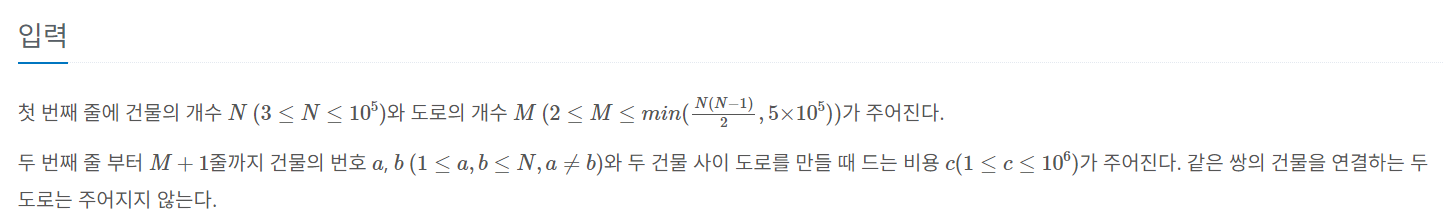 첫 번째 줄에 건물의 개수 $N$ $(3 \le N \le 10^5 )$와 도로의 개수 $M$ $(2 \le M \le min( {N(N-1) \over 2}, 5×10^5)) $가 주어진다. 두 번째 줄 부터 $M + 1$줄까지 건물의 번호 $a$, $b$ $(1 \le a, b \le N, a ≠ b)$와 두