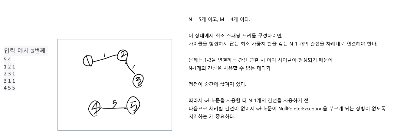 - 콘솔창에서는 일반 케이스에 대한 답은 나오지만, 단절된 케이스의 경우 while문에서 사용 간선 수가 N-1이 되기 전에 pQ상에 처리할 다음 정점이 존재 하지 않아서 NullPointerException이 뜨는 문제가 있다.