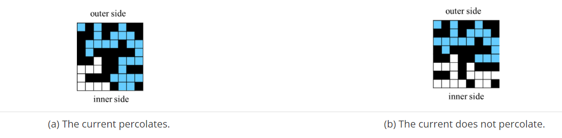 인제대학교 생화학연구실에 재직중인 석교수는 전류가 침투(percolate) 할 수 있는 섬유 물질을 개발하고 있다. 이 섬유 물질은 2차원 M × N 격자로 표현될 수 있다. 편의상 2차원 격자의 위쪽을 바깥쪽(outer side), 아래쪽을 안쪽(inner side)라고 생각하기로 한다. 또한 각 격자는 검은색 아니면 흰색인데, 검은색은 전류를 차단하는 물질임을 뜻하고 흰색은 전류가 통할 수 있는 물질임을 뜻한다. 전류는 섬유 물질의 가장 바깥쪽 흰색 격자들에 공급되고, 이후에는 상하좌우로 인접한 흰색 격자들로 전달될 수 있다.