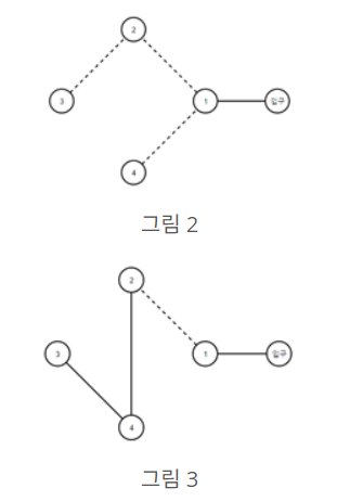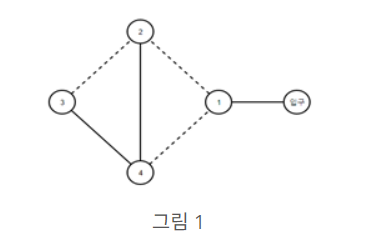 국민대학교 홍보대사 국희는 여름방학을 맞아 고등학생들을 대상으로 학교 내부에 있는 건물을 소개해주는 일을 하게 되어 학교 건물을 차례로 소개할 수 있는 이동 경로를 짜보기로 하였다. 국민대학교는 북한산의 정기를 받는 위치에 있어 건물 간 연결된 길이 험난한 오르막길일 수도 있고, 내리막길일 수도 있다. 국희는 먼저 입구를 기준으로 건물 간 연결된 도로가 오르막길인지, 내리막길인지를 파악하여 오르막길인 경우 점선, 내리막길인 경우 실선으로 표시하였다.