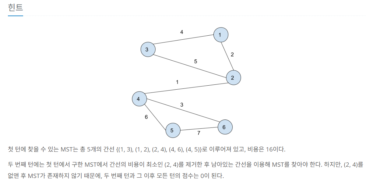 - 이 과정은 K턴에 걸쳐서 진행되며, 첫 턴에는 입력으로 주어진 그래프의 MST 비용을 구해야 한다.