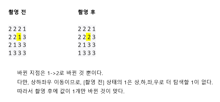 - (2) BFS()로 탐색하면서, target값은 시작점인 before[i][j]값을 세팅해두고, change할 값은 after[i][j]값을 세팅하며 BFS 탐색을 시도한다.