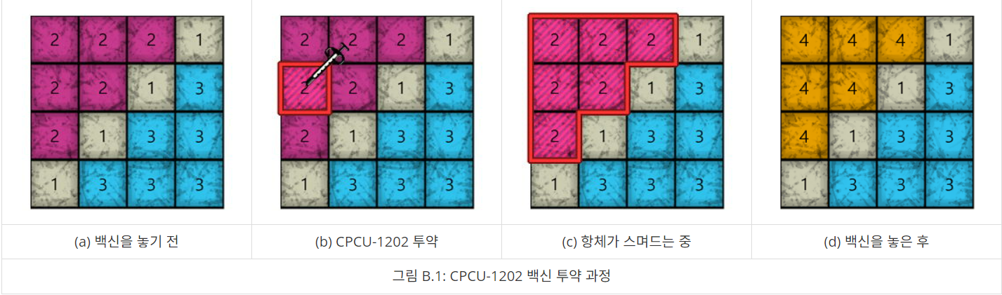 조직에 CPCU-1202 백신을 놓으면, 격자의 칸 중 하나에 항체가 생성된다. 이 항체는 현재 속해 있는 칸과 같은 데이터 값을 가지면서 상하좌우로 인접한 칸이 있을 경우 그 칸으로 퍼져나간다. 이 과정을 계속 반복하다가 항체가 더 이상 퍼져나갈 수 없게 되면, 항체는 조직에 완전히 스며든다. 그 결과로, 항체가 퍼졌던 칸들의 데이터 값은 모두 어떤 동일한 값으로 새로 업데이트된다. 이때, 우연히 원래의 데이터 값과 업데이트된 데이터 값이 동일할 수도 있다.
