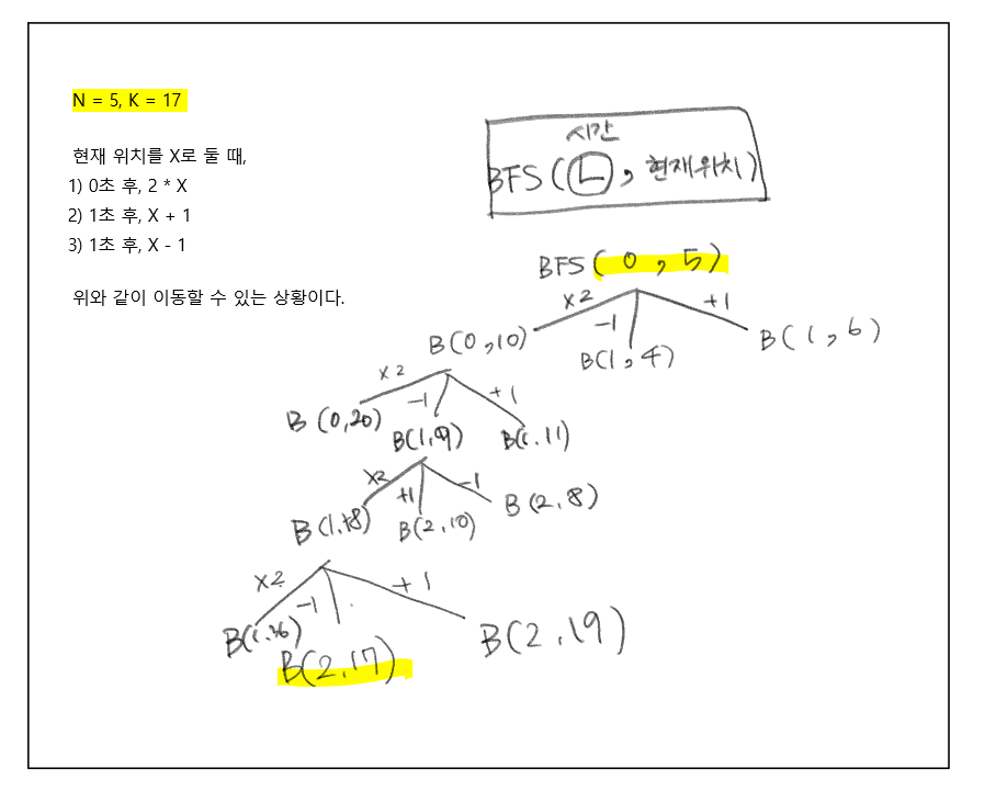 - 2배 좌표로 가거나 +1 좌표로 갈 때 100,000보다 크지 않도록 제한이 있어야 하고, -1좌표로 갈 때는 0보다 크거나 같은 값인지 제한을 걸어두면서 Queue에 담아야 한다.