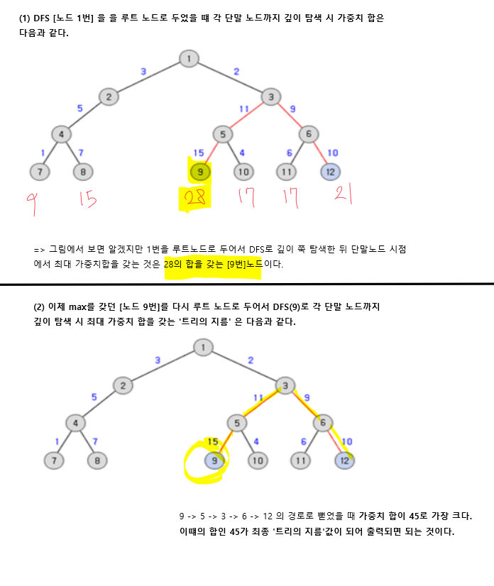 - 이 문제의 경우 지름을 구할 때 두 노드 사이의 거리가 최대 길이 가 되도록 하여 그 값을 출력하는 문제이다.