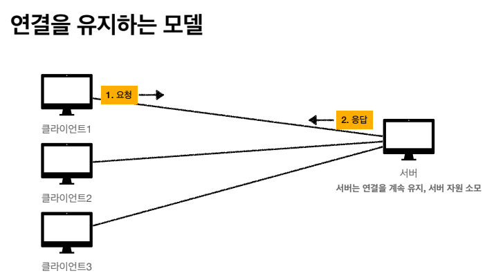 - 요청할 때마다 연결하고 응답보낸 뒤에는 즉시 끊는다.
