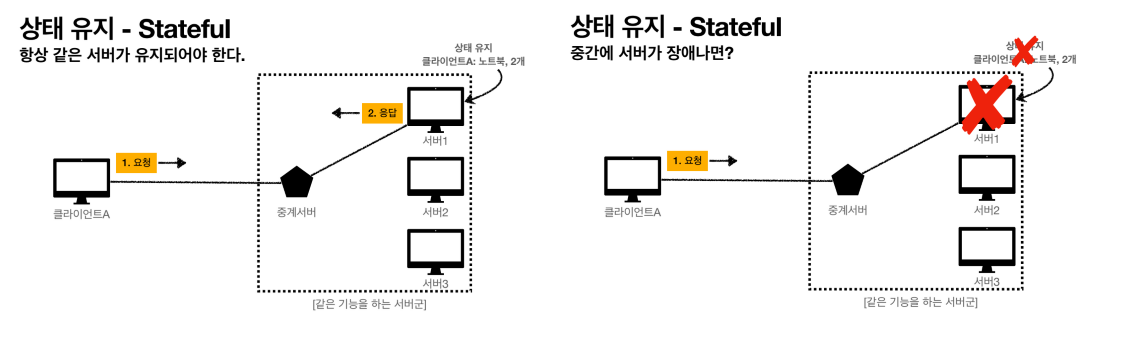 - 상태 유지 : 중간에 다른 서버 교체 시, 다시 상태 정보를 다른 서버에 알려줘야 한다.