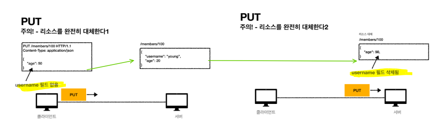 - 서버는 기존에 있던 데이터를 날리고 클라이언트가 보낸 리소스로 완전히 대체하기 때문에 보내진 age는 업데이트하는 반면 username 자체는 날려버린다.