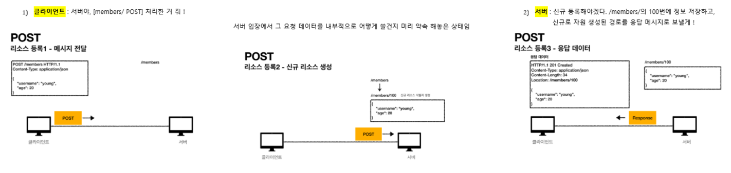서버에는 그 데이터를 내부적으로 어떻게 쓸지 약속이 되어있는 상태여서, 그에 따른 구체적인 행위를 할 것이다. 예시의 경우, ‘신규 생성 처리’로 약속된 상태이다. 그래서 서버는 신규로 /members/에 100번 사용자로 신규 리소스 식별자를 생성한 뒤, 신규로 자원이 생성된 경로를 응답 메시지로 보낸다.