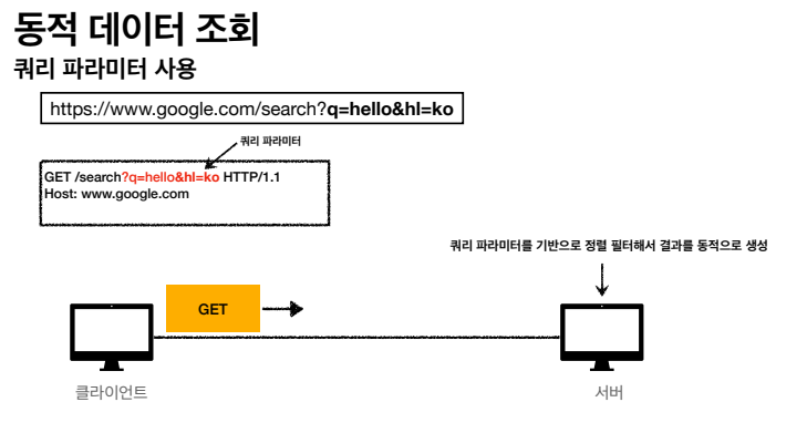 - 서버는 쿼리 파라미터를 기반으로 key-value로 꺼내서, 정렬 필터 후 결과를 동적으로 생성한뒤 클라이언트에게 응답한다.