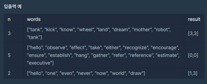 - 만약 주어진 단어들로 탈락자가 생기지 않는다면, [0, 0]을 return 해주세요.