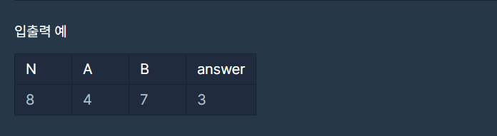 public int solution(int n, int a, int b){