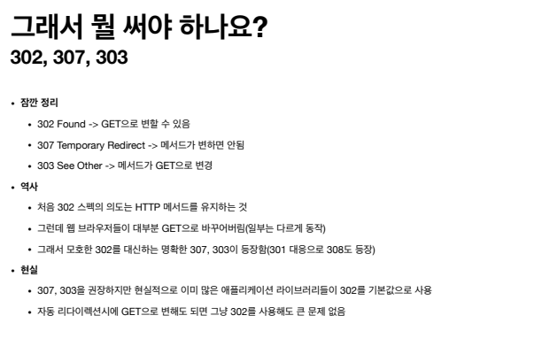 - 추후 리다이렉트 요청 메서드는 GET으로 변하고, 본문 메시지가 제거될 수 있다
