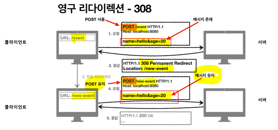 클라이언트가 /event 내부에 HTTP 바디 메시지에 사용자를 event에 등록하겠다고 POST로 요청하면 서버는 /new-event 를 쓰겠다고 클라이언트에게 308 상태코드를 보내는데, 이때 새 경로로 리다이렉트된 이후에ㄷ, 요청 시에 POST를 그대로 유지하면서 && HTTP 바디 메시지도 그대로 유지된다.