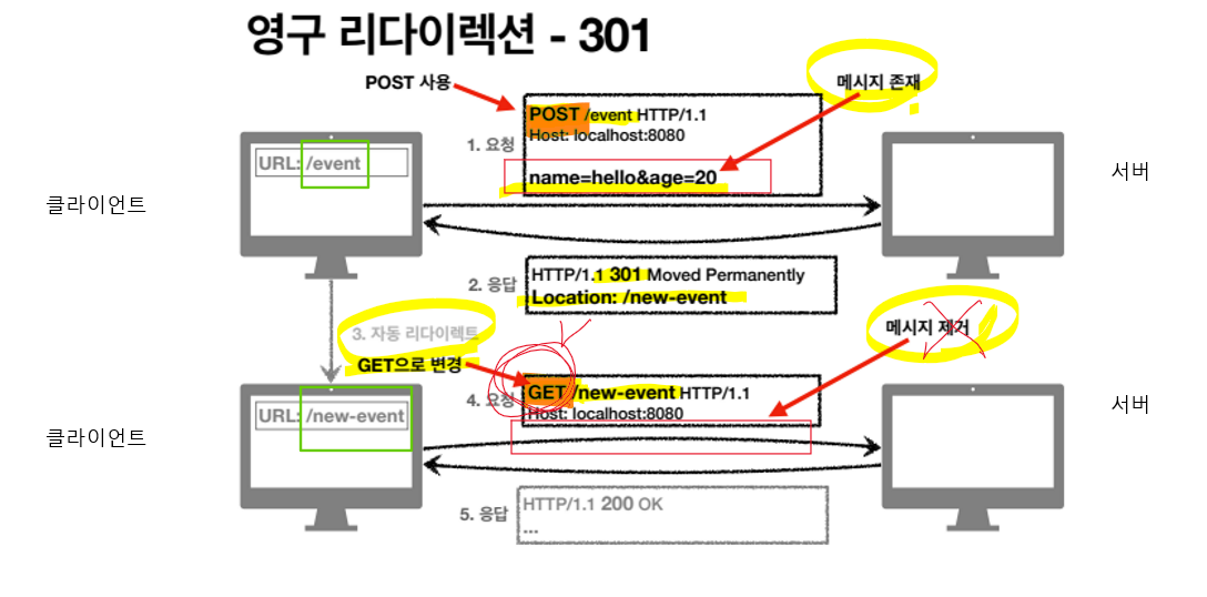 아래 그림예시로 보자. 클라이언트가 /event 로 HTTP 바디 메시지에 사용자를 event에 등록하겠다고 POST로 요청했다. 서버에서는 더 이상 사용하지 않으니 /new-event로 쓰겠다고 클라이언트에게 301 상태코드를 보낸다. 그러면 클랄이언트는 새 경로로 자동 리다이렉트 되는데, 리다이렉트 이후의 요청 메서드가 GET으로 변하고 본문이 제거될 수 있다는 거다.
