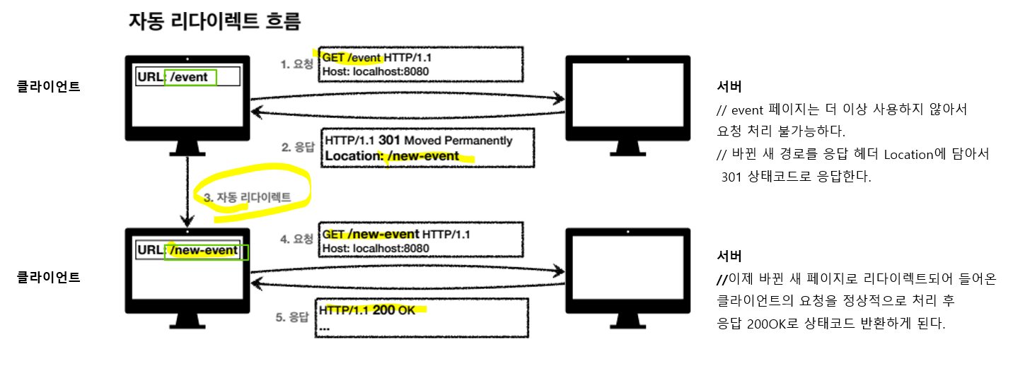 - 클라이언트가 /event 페이지로 GET 요청을 보냈는데, 서버는 더 이상 사용하지 않는 해당 페이지의 새 위치를 Location헤더에 /new-event 담아 상태코드 301로 응답한다.