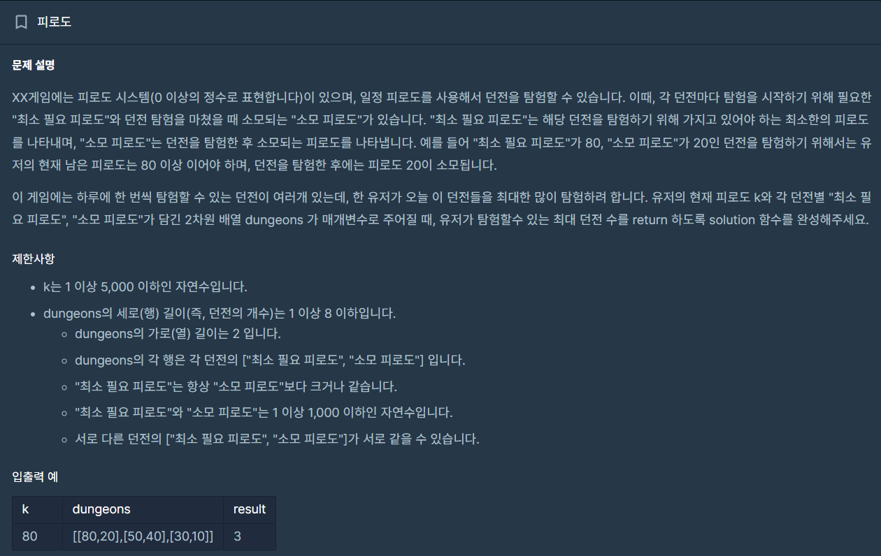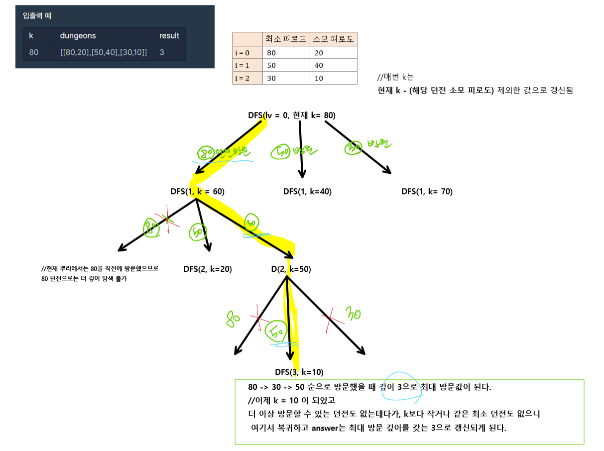 - 문제의 예시에서 현재 k= 80인데, 3개의 던전 중 80→30→50 순으로 간다면 3곳을 모두 방문이 가능하다.