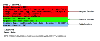 - Request 헤더 : 요청 보낼 때 들어가는 정보 예) User-Agent: Mozilla/5.0 (Macintosh; ) :