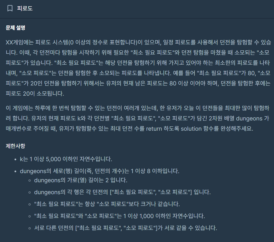 ⬛ 프로그래머스 | LV.2 피로도 - 완전 탐색, DFS 문풀 https://school.programmers.co.kr/learn/courses/30/lessons/87946 프로그래머스 코드 중심의 개발자 채용. 스택 기반의 포지션 매칭. 프로그래머스의 개발자 맞