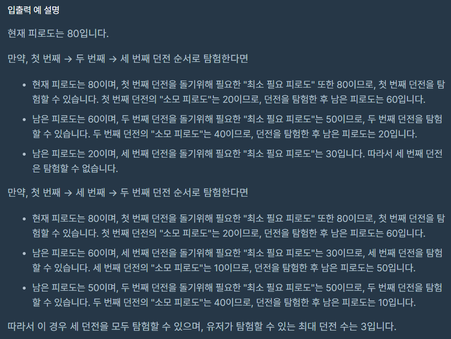 예를 들어 80 → 30 → 50 순으로 던전을 방문하면 최대 3개의 던전 탐험이 가능하지만