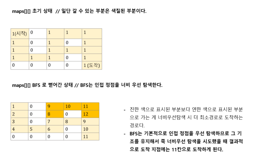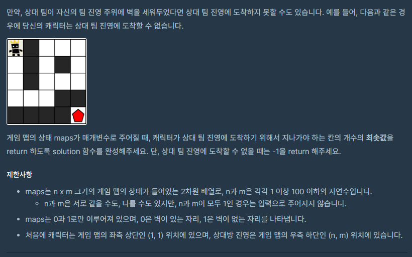 - 물론 벽에 가로막혀서 못 가는 경우도 있기 때문에 이런 경우는 BFS로 순회를 다 했는데도 불구하고 여전히 maps[N-1][N-1] 값이 1이라면 도달 못했다는 의미이므로 -1을 리턴하고, 그게 아니라면 maps[N-1][N-1]값을 그대로 리턴하여 정답을 구할 수 있다.