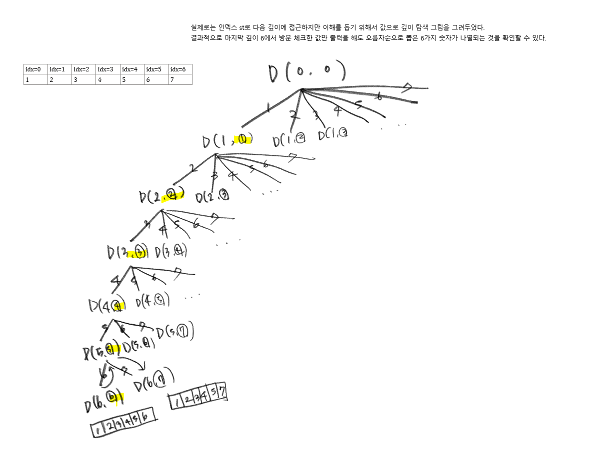 - DFS로 for()문을 돌면서 내부적으로 st ~k로 순회하며 다음 깊이를 순차적으로 방문하고 있고, 입력으로 들어온 arr 배열이 기본적으로 오름차순으로 들어온다고 되어있기 때문에 DFS로 쭉 깊이탐색하며 방문 처리한 값만 출력해도 자동으로 사전 순 정렬되어 출력될 것이다.