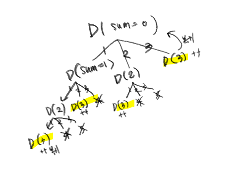 - DFS로 깊이 탐색을 시도할 때 방문 체크할 필요없이 매번 1~3 의 값을 더해보면서 다음 깊이를 탐색한다.
