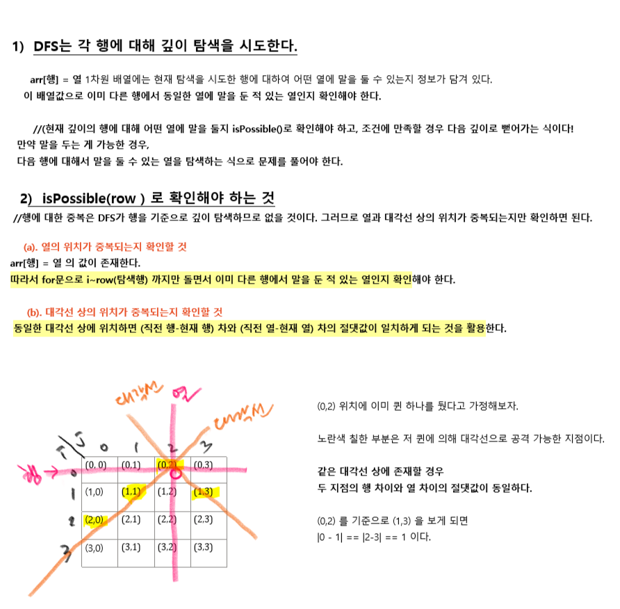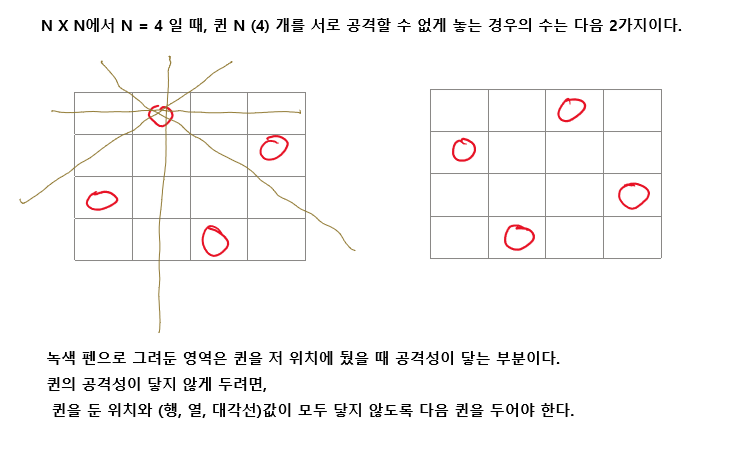 2) N=4라고 하면 칸이 16칸이 나오는데, 어떤 칸에 퀸을 두는 지에 따라 다음 퀸을 어디에 둘 수 있는지도 달라지므로 백트래킹으로 모든 경우의 수를 다 순회하면서 탐색해보고 경우의 수를 따져봐야 전체 몇 가지 방식으로 N개 퀸을 둘 수 있는지 알 수 있다.
