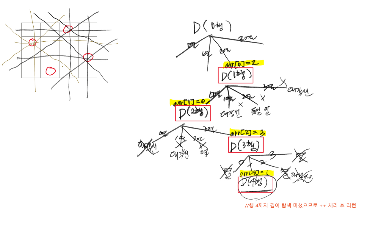 count++;//여기까지 깊이 행이 도달했다면 모든 행에 퀸을 두었다는 것이므로 ++처리